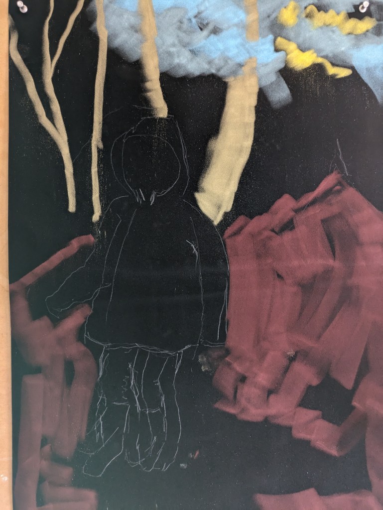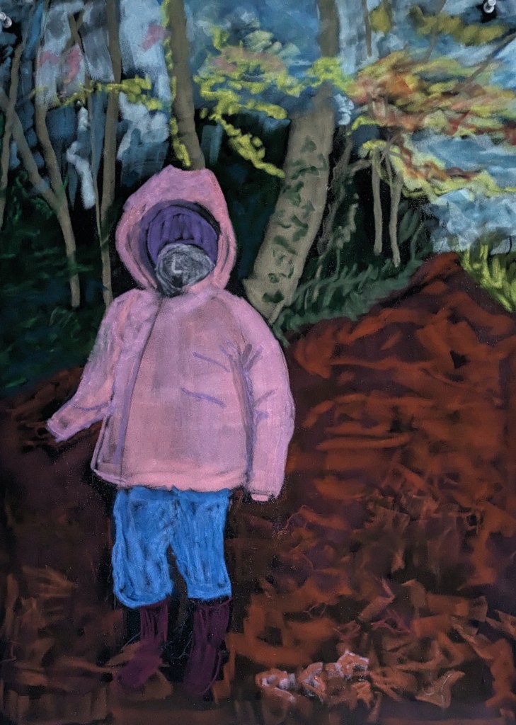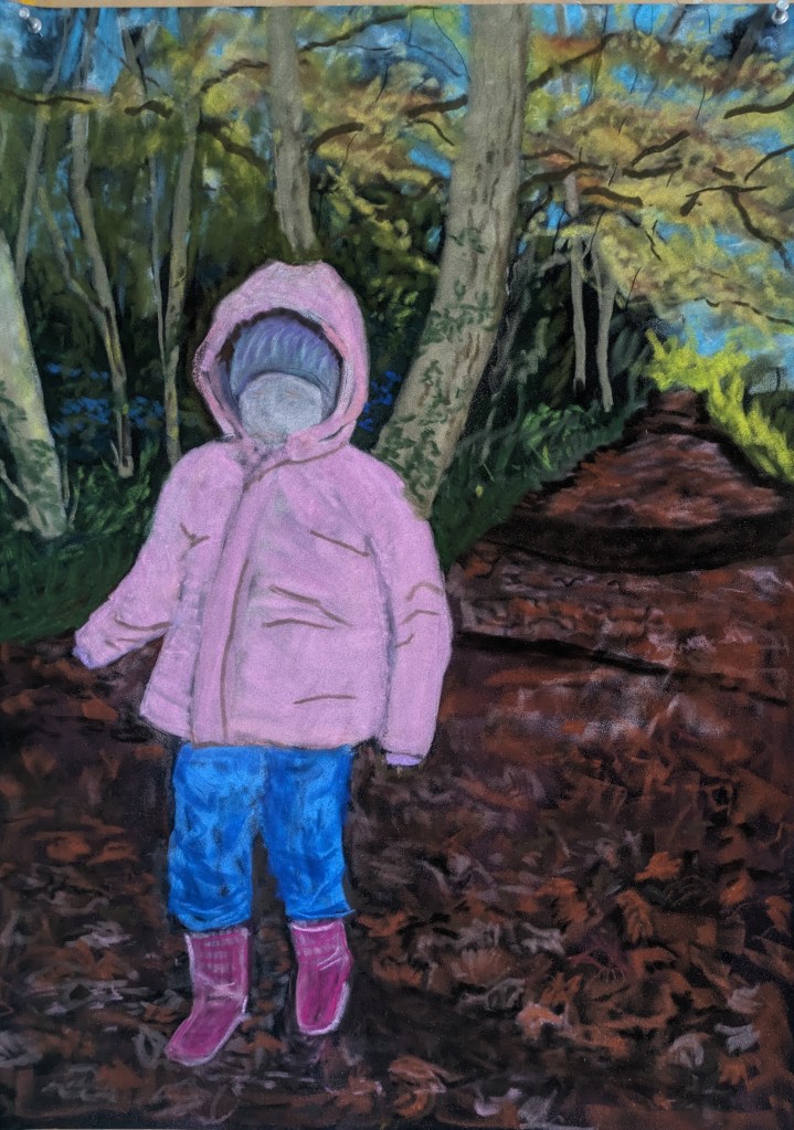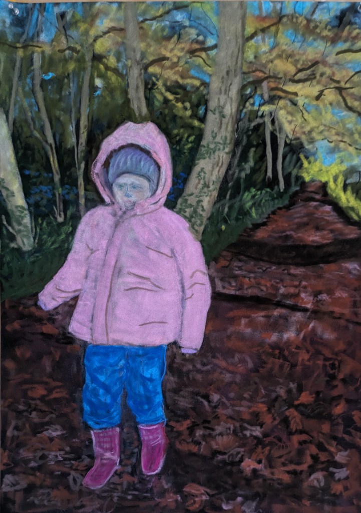 The ongoing work is in this section. I have been drawing again in pastel. Its like an extension to how at ease I have been with the charcoal. I’m still undertaking research on other specific artists to support my work. see research section. I begin another child image from a photo of my friends child. Its 40×70 cm on velour. I start to sketch in the shapes of trees, the pathway of leaves and the outline of the figure. With this medium and the fact that the background is black it is easy to cover up in colour and either blend in another colour or colour over the first one. I work on all areas quickly for accuracy and just keep changing my colours. The face I will leave mainly till last.