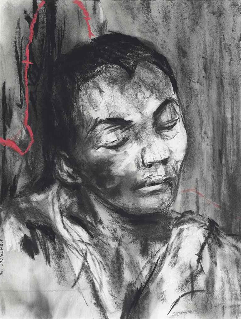 I include a couple of works by Kentridge that are quite powerful. This image is of Nandi who lies dead on the road. She features in one of his animations. The outer lines are heavy and he adds red into the drawing. He picks out the lighter planes on her face and there is a serenity about her.