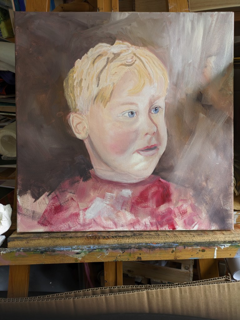 At this juncture I include a bit more work that I am trying to prepare for Somerset Art Weeks, Open Studio. I want to eventually progress to portraiture. The one I started below is of a friends grandchild. I’m experimenting a little and not sure as it progresses how it will be completed as I try to capture the light in his face. I’ve previously researched Rembrandt and Caravaggio who were real masters of the chiaroscuro. Its a slow process o building up layers in oils. I will be able to complete more than likely when the course work is complete. I have permission to use the photo on the blog and I think I’m developing a good likeness. I want to portray the angelic look of the child.