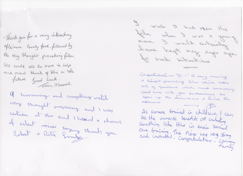 As the video started I held back a little but was scanning the room for reactions throughout. As it progressed I did notice about three or four people wipe a tear from their eyes. I had elicited that people fill in the comments book for me before the video started. Prior to its start I explained the purpose of it and some of the plans for the project to tour. Another couple of artists were there too and I asked one to take a video of me talking. Anna Goodchild sent me some videos but I have only had time to see one so far. My audience was from different community groups as well as the attendees that are in the video. Only two of the audience hadn’t seen the previous exhibition.