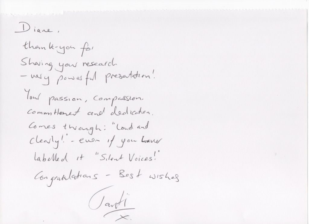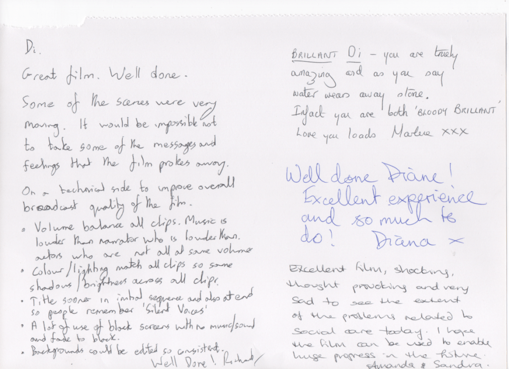 All the comments were very positive but one highlighted all the technical errors for me! Another artist suggested I could go back to the head of Somerset Film and ask her to look at it. I am going to do this in the next couple of weeks. I am sending it to my tutor as it was shown to the audience. I intend to put one or two more images in as my tutor also suggested and put these in the middle where I deliberately left the pause/curtains. I will also put one of my recent images of the children in monotone grey at the end. I include all the comments below. A couple were emails and I’ve scanned them in.