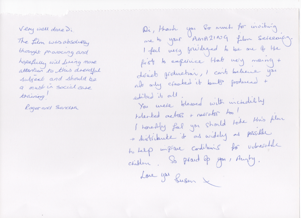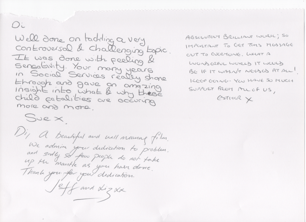 Throughout the time I was reading the numerous government inquiry reports it was hard to digest some of the failings. While a part of me came to the realisation that these children were let down by all of the agencies I felt strongly that there could have been better training for all involved. There were key elements and themes that I believed could be pulled together, written as a series of real events that people could not only be informed about but they could learn from the key messages within. My video could be used as an information film to raise awareness of these issues with the general public but I could also write it in such a manner that it could be used as a training tool for health and social care and related professions. I was prompted also to go further by the huge positive response from the public about the exhibition. I spoke to people about my hopes in that arena, for the exhibition to tour with a video.