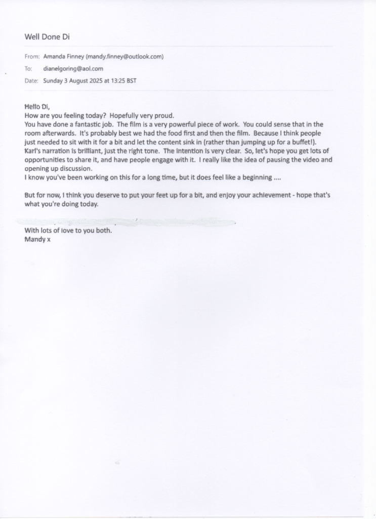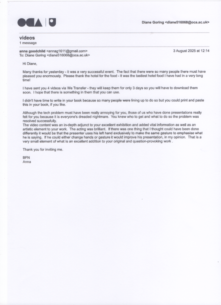 For this part of the course I include the feedback and evaluation of my exhibition that took place in November 2024. I sent this report to the ethics committee OCA. Their reply was so very positive that I was spurred on to make the video.