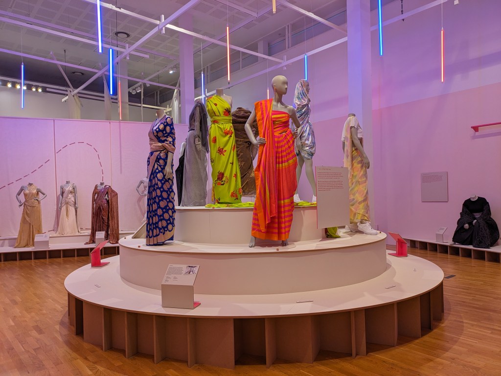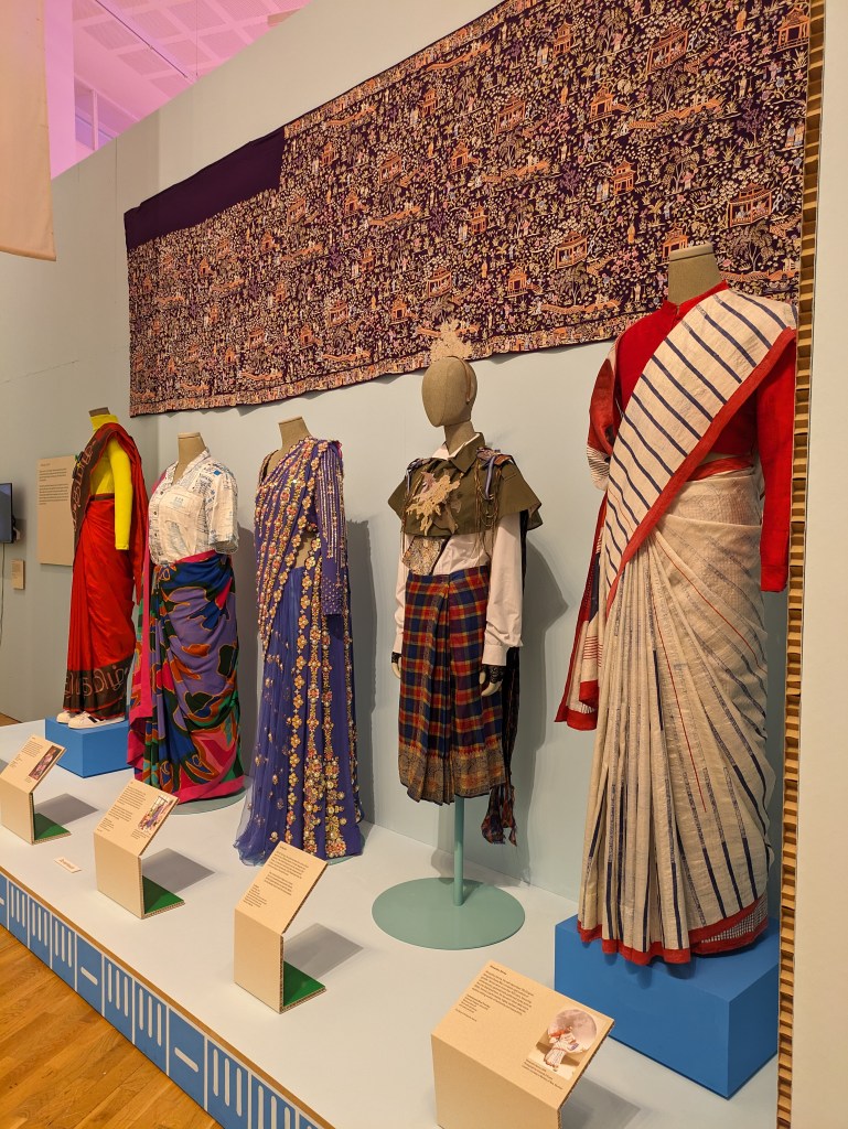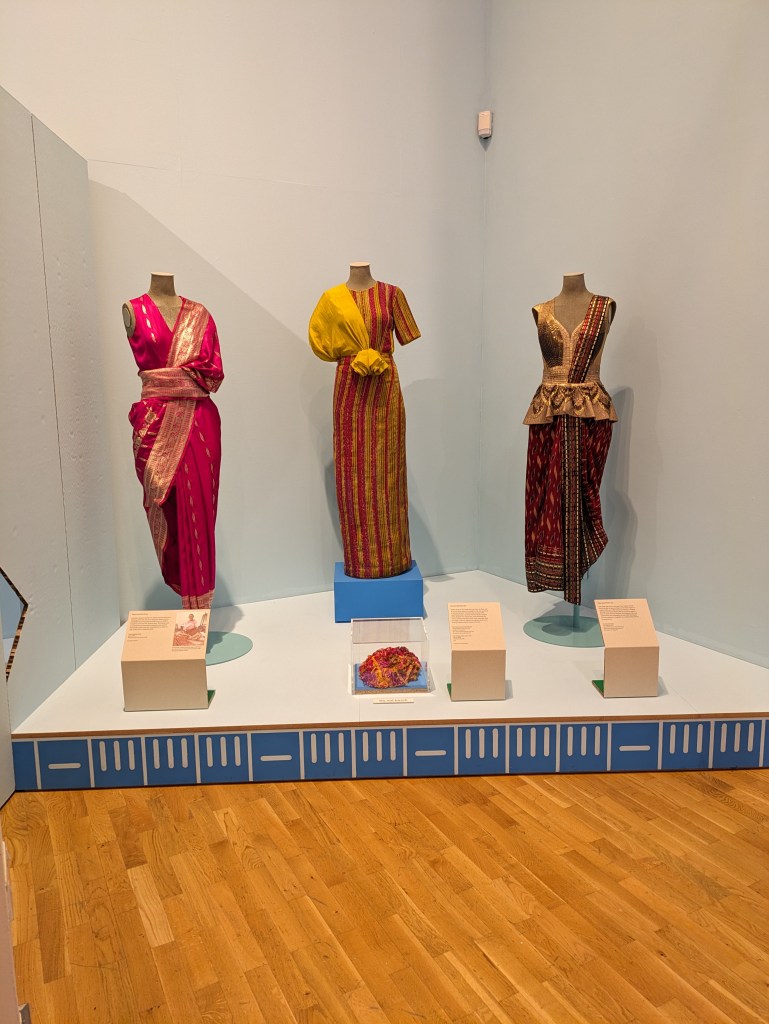 The other information I include here was about my trip to Birmingham. I visited a workshop ans was able to speak to a Psychiatrist about my project on 9th July. I also visited the MAC where I have sent a proposal. The Midlands Arts Centre is very culturally diverse in the work it shows and includes a range of contemporary art and different art forms. These can be theatre performances, dance, cinema, childrens art and productions. It also hires out gallery space and studios. Its also situated in parklands near the Centre of Birmingham. There was an exhibition on about the Sari. Some were accompanied by a write up about their origins and purpose. There were one or two very sentimental and precious Sari’s that were important family legacies and some that were reminders of some family violence. It was quite a moving exhibition and pioneered by a group of Asian women. It was on two floors. Downstairs explored the cloths used too and there were reams on show. As I went upstairs to another gallery there was several beautiful Saris’s sadly with some description but I hadn’t time to devote due to my appointment. I include a few images. Some were embroidered in fine silk and the stitching was so detailed. I also loved the way the exhibition had been curated and the use of the lights in different colours.